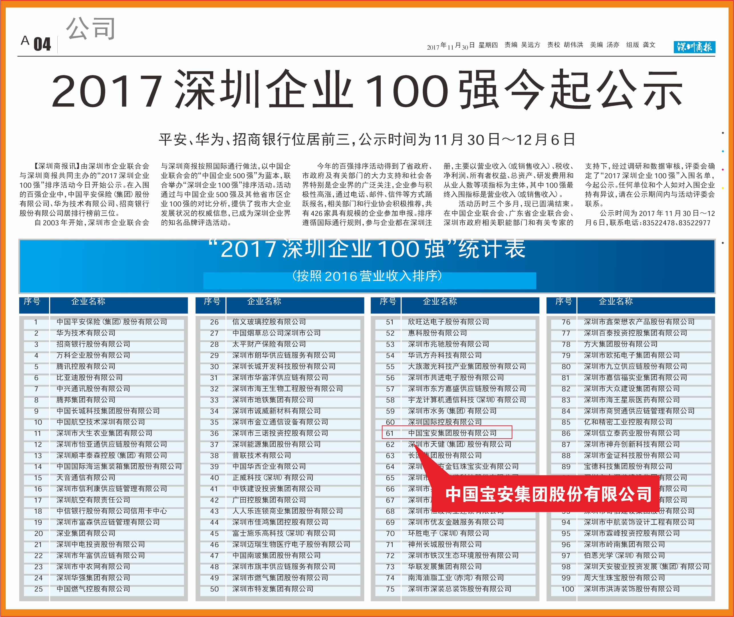11月30 日,由深圳市企业联合会与深圳商报共同主办的“2017深圳企业100强”排序活动正式开始公示,中国宝安集团在榜单中61名。